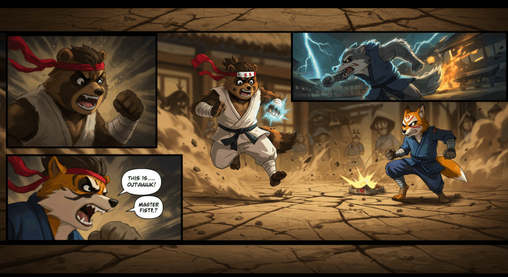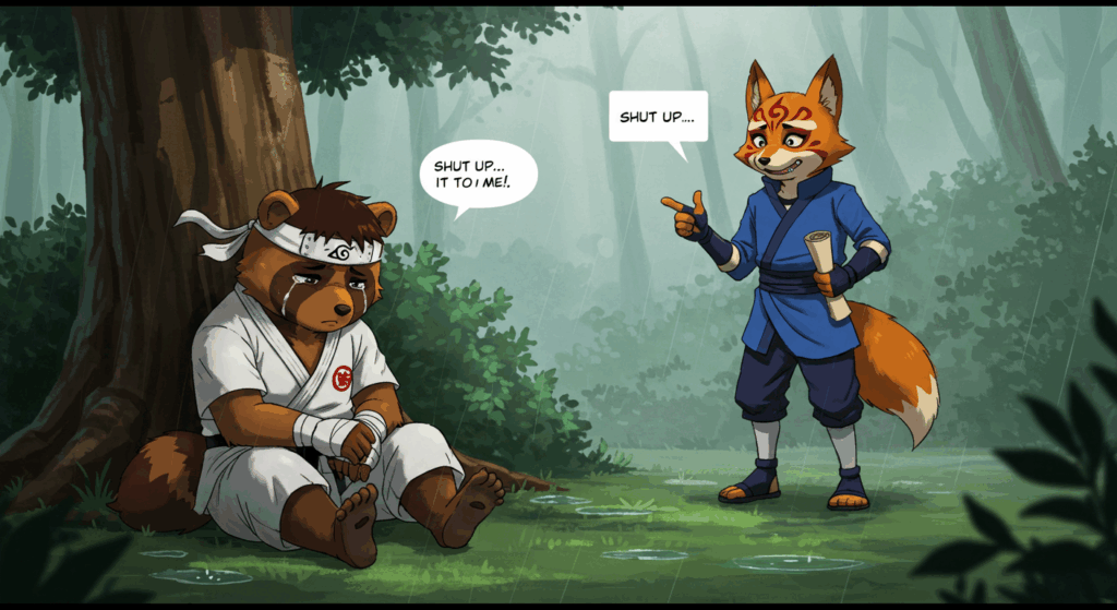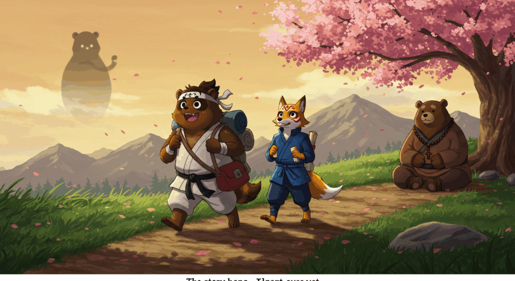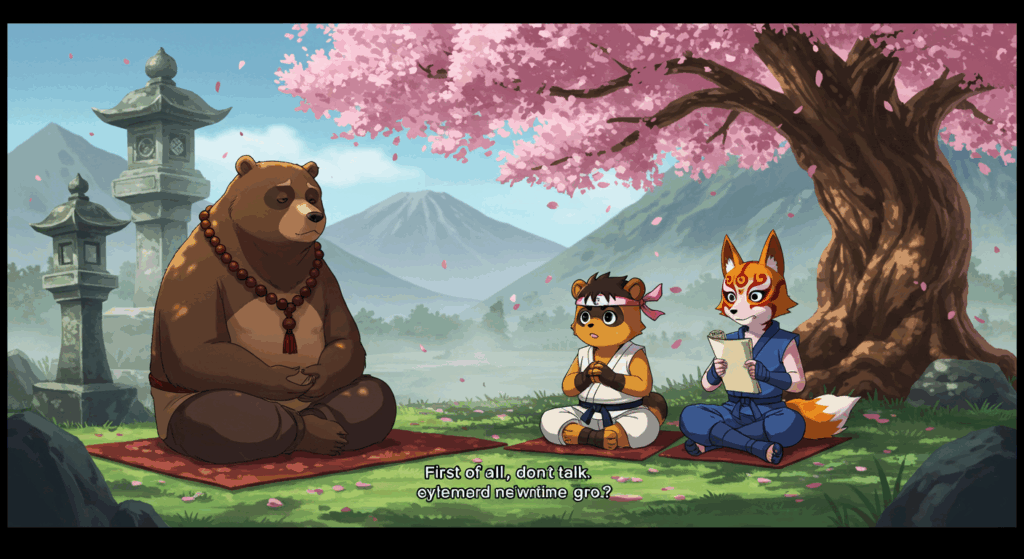「はい!朝5時集合ね!山頂まで猛ダッシュ!途中で倒れたら、熊師匠の尻叩きが飛んでくるから注意!」なんたぬきは、気合いだけで登っていた。体力?限界?そんなの知るか!ごんぎつねは冷静に地形を読みながら、最短ルートを駆けていく。「お前、走り方がちょっとたぬきすぎるぞ」「どういう意味だそれっ!?」だが、キツかったのは体力だけではなかった。熊師匠による、謎の技「拳風雷打ち」や「逆さ瞑想修行」など、意味不明な鍛錬が続く。それでも、二匹はへこたれなかった。夜には星空の下で笑い合い、「今度こそ狼に勝てるかもな」なんて話した。