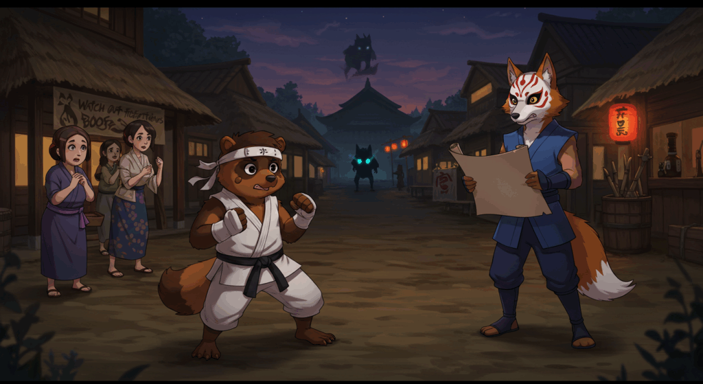 熊師匠はそう言い残し、二匹に手作りの旅袋を渡した。その中には「自分で考えろ」とだけ書かれた巻物が入っていた。
